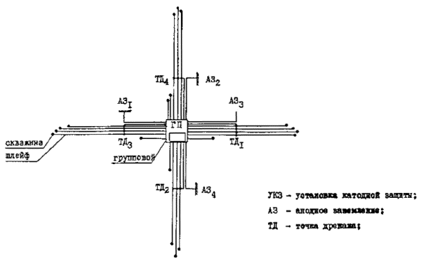 катодной защиты сооружений при крестообразном расположении скважины в кусте,