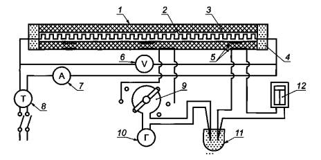 секция; 5 - термопары; 6 - вольтметр; 7 - амперметр; 8