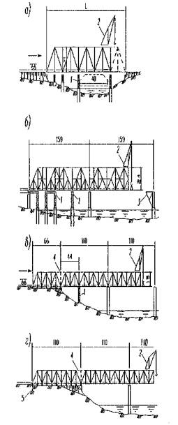 а - опоры и пролетные строения временного моста; б - временная опора для монтажа стальных пролетных строений