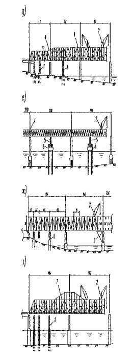 а - УП-78; б - КС-63; в - П-12; г - болтовой стык понтонов УП-78 и КС-63; д - вариант нижнего самозахватного сцепа для сборки и разборки понтонов УП-78 и КС-63 наплаву; е - замковый стык понтонов П-12