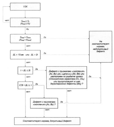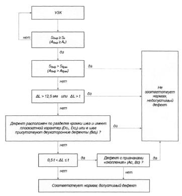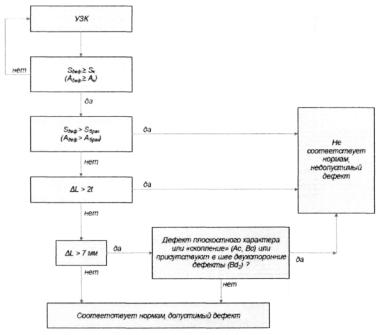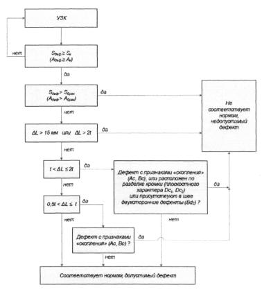 уровней расположения внутренних и (или) наружных поверхностей свариваемых (сваренных) деталей в стыковых сварных соединениях. 3.31 суммарная максимально допустимая протяженность дефекта (совокупности дефектов) ∑Д, мм: Допустимая величина суммы длин дефектов (совокупности дефектов) вдоль шва. Примечания 1 Для труб диаметром ≤ 530 мм оценивается на участке сварного шва равном 1/6 периметра; 2 Для труб диаметром > 530 мм оценивается на участке сварного шва равном 300 мм. 3.32 схематизация групповых дефектов: Замена группы близко расположенных исходных дефектов расчетным дефектом - аналогом. 3.33 схематизация одиночных дефектов: Замена исходных дефектов, обнаруженных методами неразрушающего контроля, расчетными дефектами- аналогами. 3.34 технология контроля качества: Комплекс операций, материалов и оборудования, который на основе количественных показателей объективно информирует о фактическом качестве сварных соединений газопроводов. 3.35 технологическая карта контроля качества: Документ, утвержденный организацией, выполняющей контроль качества сварных соединений, в котором изложено содержание и правила выполнения конкретных работ, описаны все технологические операции и их параметры в соответствии с требованиями настоящего стандарта. 3.36 толщина стенки трубы S, мм: Минимальная фактическая толщина стенки трубы в зоне сварного соединения. 3.37 ультразвуковой контроль: Неразрушающий контроль, основанный на возбуждении в контролируемом материале упругих колебаний и анализ дальнейшего процесса распространения ультразвуковых волн. 3.38 уровень качества сварных соединений объектов