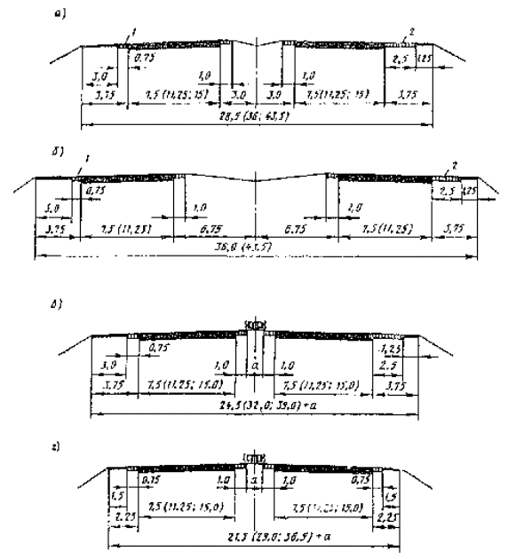 в - с уменьшенной шириной разделительной полосы; г - то же, разделительной