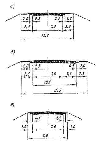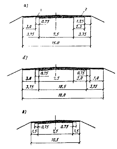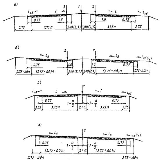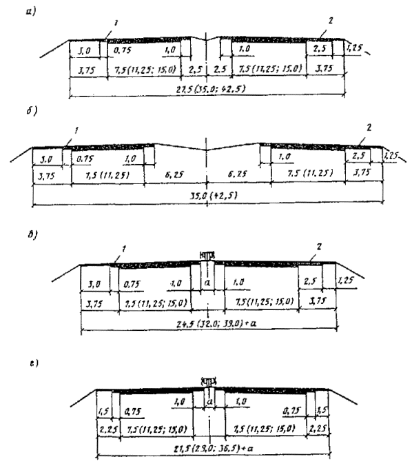 Рис. 4. Поперечные профили автомобильных дорог II категории: а - в обычных условиях с укрепленной (1) и