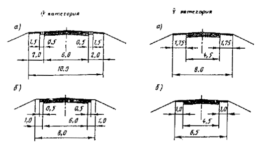 Рис 6. Поперечные профили автомобильных дорог IV и V категорий: а - в обычных условиях; б - с уменьшенной шириной
