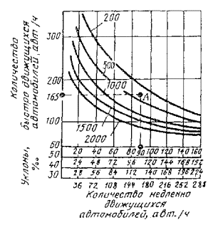 4.13. В тех случаях, когда интенсивность движения автопоездов превышает 25% общей интенсивности, а объемы грузов, транспортируемых по дороге автопоездами, составляют более 50% общего объема грузоперевозок, при проектировании параметров поперечного и продольного профилей следует выполнять технико-экономическое сопоставление принимаемых проектных решений с учетом средней скорости и безопасности движения транспортного потока. 4.14. В отдельных случаях при технико-экономическом обосновании устройства дополнительной полосы на затяжных подъемах рекомендуется пользоваться номограммой (рис. 7), построенной на основе оценки потерь времени быстро движущимися автомобилями при различной интенсивности и составе движения, а также сравнения стоимости этих потерь со стоимостью строительства полосы. Строительство полосы экономически целесообразно, если точка пересечения перпендикуляров, построенных из точек, соответствующих количеству быстро и медленно движущихся автомобилей, находится выше кривой, соответствующей длине подъема. Рис. 7. Номограмма для определения целесообразности устройства дополнительной полосы на подъем (цифры у кривых - длина подъема, м) 4.15(4.11). Ширину разделительной полосы на участках дороги, где в перспективе может потребоваться увеличение числа полос движения, необходимо увеличивать на 7,5 м при устройстве двух дополнительных полос и на 15 м - четырех дополнительных полос. При этом следует учитывать, что при ширине разделительной полосы более 12 м создаются наилучшие условия движения. 4.16(4.12). Ширину разделительной полосы на участках дорог, проложенных по ценным землям, на особо трудных участках дорог в горной местности, на больших мостах, при проложении дорог в застроенных районах и т.п., при соответствующих технико-экономических обоснованиях допускается уменьшать до ширины, равной ширине полосы для установки ограждений плюс 2 м. Переход от уменьшенной ширины разделительной полосы к ширине полосы, принятой на дороге, осуществляется с обеих сторон с отгоном 100:1. При проектировании участков автомобильных дорог с многополосной проезжей частью необходимо рассматривать варианты их стадийного строительства с сокращением единовременных капитальных затрат и возможностью реконструкции в перспективе. Целесообразны следующие варианты развития поперечного профиля: устройство вначале одной проезжей части с организацией на ней двухстороннего движения, а затем достройка второй проезжей части и разделительной полосы с организацией одностороннего движения в каждом направлении; увеличение числа полос движения за счет уширенной разделительной полосы. При стадийном сооружении дороги ширина полосы отвода и параметры искусственных сооружений и земляного полотна рассчитывают на перспективное число полос движения. При определении сроков стадийного увеличения числа полос движения следует исходить из достигаемого на определенный период уровня удобства движения, который характеризуется обеспечиваемой скоростью движения, коэффициентами загрузки и насыщенности. В табл. 11 приведены значения коэффициентов загрузки, соответствующие предельным условиям функционирования дороги различного назначения. 4.17(4.17). Для повышения устойчивости автомобиля при движении по кривым в плане необходимо предусматривать устройст