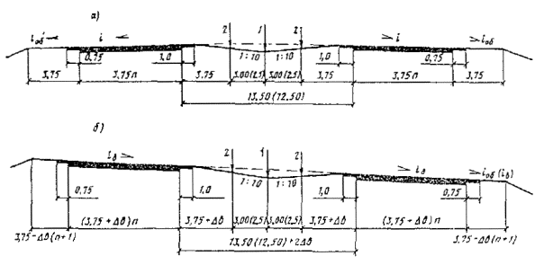 Поперечные уклоны проезжей части на виражах следует назначать в зависимости от радиусов кривых в плане по табл. 12(8). Если две смежные кривые в плане обращены в одну сторону и прямая вставка между ними составляет 100 м и менее пли отсутствует, то односкатный поперечный профиль следует принимать непрерывным на протяжении двух кривых и прямой вставки. 4.18(4.18). Переход от двускатного поперечного профиля к односкатному на дорогах I категории можно выполнять различными способами в зависимости от ширины разделительной полосы: 13,5(12,5) м - вращением проезжих частей вокруг перспективных кромок проезжей части с учетом увеличения числа полос движения за счет разделительной полосы (рис. 8); 6(5) м - вращением проезжих частей вокруг кромок проезжей части, примыкающих к разделительной полосе (рис. 9, а, б); 2 м - вращением проезжих частей вокруг оси дороги (рис. 9, в, г).
