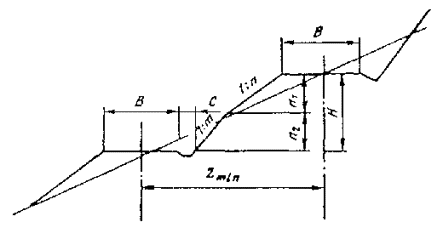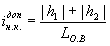 где h1 - превышение кромки проезжей части при достижении нулевого поперечного уклона, м; h2 - то же, на вираже относительно оси вращения, м; i - уклон проезжей части при двускатном поперечном профиле, %о; LО.В - минимальная длина отгона виража из условия дополнительного продольного уклона, %о;