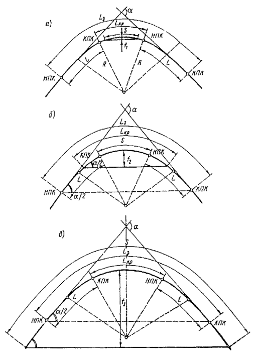 Рис. 11. Схема для расчета величины срезки в середине кривой: а - S < Lкр, б - Lкp < S < Lз; в - S > Lкр; НПК,