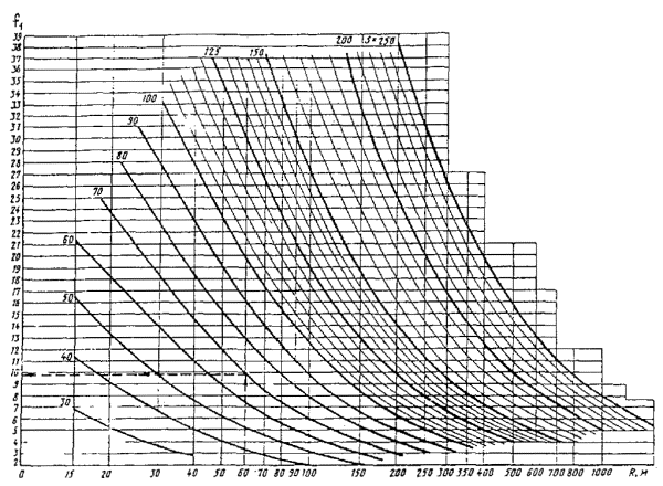 т.е. получаем формулу, которая приводится в учебной и справочной литературе. Расчет стрелы видимости по формулам (8), (9), (14) с применением микрокалькулятора не представляет особой сложности, но в целях значительного упрощения и ускорения определения fi предлагаются номограммы (рис. 12, 13). 4.37. Обеспечение необходимой видимости на дорогах в горной местности при большой крутизне склонов нередко сопряжено с необходимостью разделки весьма больших скальных выемок. В таких случаях следует рассматривать вариант уменьшения срезки за счет принятия расстояния видимости не встречного автомобиля, а для остановки. При этом необходимо обеспечить раздельное но направлениям движение автомобилей на участках внешних кривых путем устройства по оси проезжей части разделительных островков или выступающих бордюров. Кроме того, обочины на таких участках должны иметь ширину не менее 3 м и должны быть укреплены на всю ширину. В начале и конце участка раздельного движения следует предусматривать соответствующие знаки. Вариант с разделительными островками (или бордюрами) принимается на основе технико-экономического обоснования. Одним из способов увеличения расстояния видимости является установка на кривых выпуклых зеркал. Эксперименты показали, что скорости движения и безопасность на участках внешних кривых при этом несколько увеличиваются, в особенности при углах поворота более 80°. Рис. 12. Номограмма для определения стрелы видимости f1 на автомобильных дорогах при S < Lкp Рис.