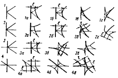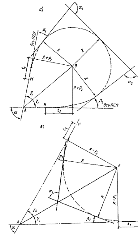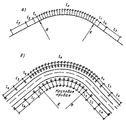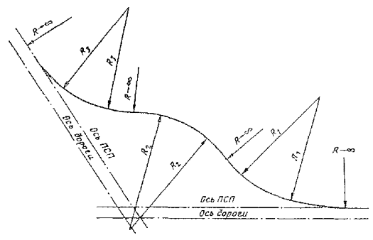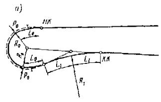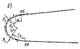 - II рода 4.47. На практике иногда применяют так называемые "полусерпантины", у которых с одной стороны центрального угла отсутствует вспомогательная кривая (рис. 15, а), а также так называемые "петли", представляющие собой кривые малого радиуса (15-30 м), сопрягающие подходные, почти параллельные участки трассы (см. рис. 15, б).