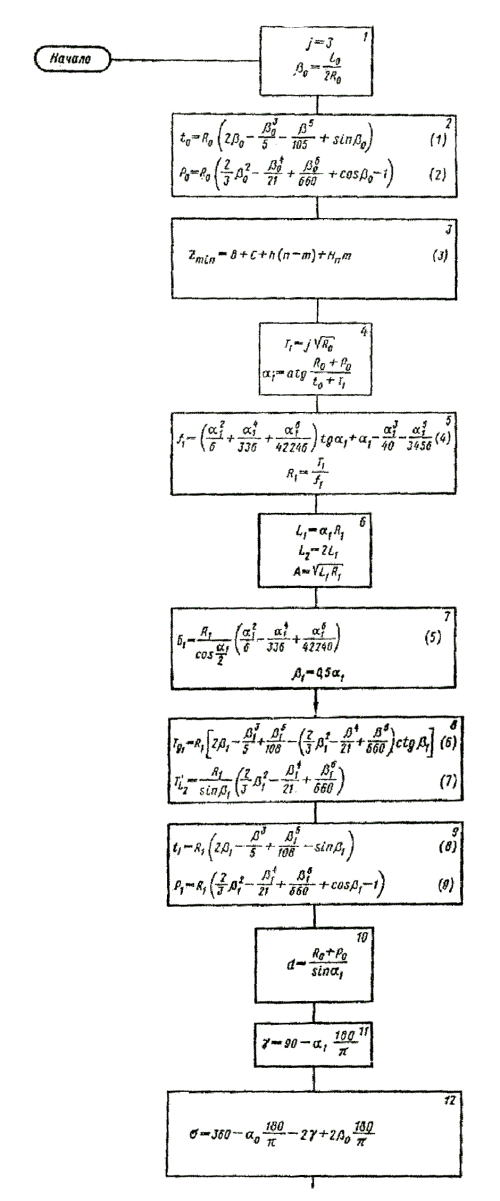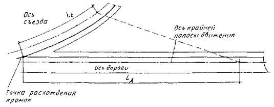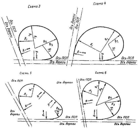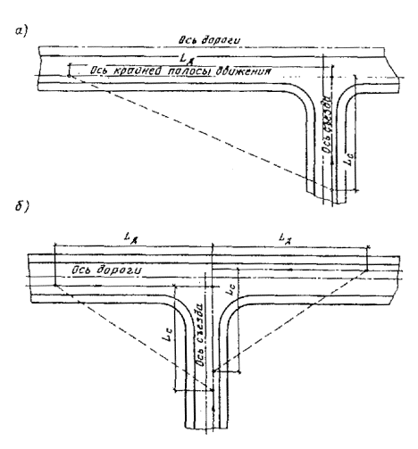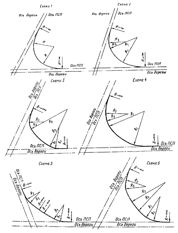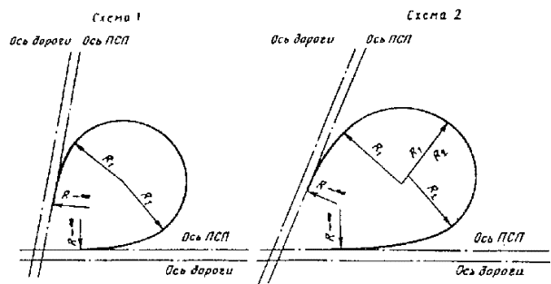 поворота 5.18. При недостаточной видимости на главной дороге вместо пересечения допускается проектировать два смещенных примыкания второстепенной дороги. Смешение примыканий допускается в том случае, если отсутствует перспектива, реконструкции пересечения, а также если интенсивность пересекающего потока на второстепенной дороге между примыканиями не вызовет существенных помех движению. Причем смещение вправо предпочтительнее, чем влево. 5.19. В тех случаях, когда соединяются более четырех примыканий дорог, а приведение к простым схемам затруднено, либо когда интенсивности движения на пересекающихся дорогах одинаковы или отличаются не более чем на 20%, а интенсивность левоповоротного движения составляет не менее 40% интенсивности на пересекающихся дорогах, допускается проектировать кольцевые пересечения. На дорогах большого протяжения кольцевые пересечения не рекомендуются. При проектировании кольцевых пересечений необходимо обеспечивать своевременную информацию об их наличии, их видимость из условия безопасного обгона, а в ночное время - освещение с помощью светильников, установленных напротив каждого въезда. Диаметр центрального островка рекомендуется принимать 100 м, а наименьшего - 60 м. Кольцевая проезжая часть должна иметь ширину не менее 11 м. 5.20(5.10). Минимальный радиус сопряжения (по внутренней кромке проезжей части) на пересечениях и примыканиях в одном уровне принимают с учетом категории дороги, с которой происходит съезд, независимо от угла пересечения и примыкания: при съездах с дорог I, II категорий - не менее 25 м, III категории - 20 м и IV - V категорий - 15 м. Если сопряжение выполняется под тупым углом, рекомендуется предусматривать увеличение радиусов до 30-50 м. При расчете на регулярное движение автопоездов (более 25% в составе потока) радиусы кривых на съездах следует увеличивать до 30 м. 5.21. Сопряжение пересекающихся дорог должно включать входные и выходные переходные кривые в соответствии с траекторией движения автомобиля (при переходе с прямой на кривую и смещении при поворотах падких колес автомобиля по отношению к передним). Переходные кривые сопряжения могут быть заменены круговыми кривыми из условия сопряжения входной кривой пол углом 15°, выходной кривой - 20°. Радиус входной кривой принимают равным двум минимальным радиусам круговой кривой на сопряжении (см. п. 5.20(5.10)), а радиус выходной кривой - трем наименьшим радиусам сопряжения пересечения для второстепенной дороги. 5.22(5.11). Обеспечение видимости в местах расположения пересечений и примыканий дорог - важнейший фактор организации движения и его безопасности. В зоне пересечений или примыканий необходимо обеспечивать видимость водителям, подъезжающим к ним по главной и второстепенной дорогам, из условия остановки автомобилей до пересекаемых полос движения. Расстояния видимости для остановки должны быть не менее приведенных в табл. 13(10) для соответствующих расчетных скоростей движения на пересекаемых дорогах. При этом расположение глаз водителя принимают на расстоянии 1,75 м от кромки проезжей части. В пределах зоны видимости наличие насаждений и застройки не допускается, за исключением случая, если они представляют особую ценность. 5.23. При проектировании велосипедных дорожек в зоне пересечений и примыканий целесообразно предусматривать их вынесен