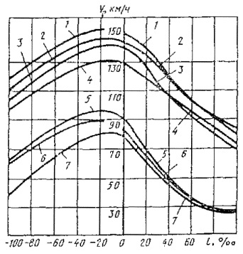где Lуч, - протяженность участка трассы, км; γ - коэффициент, учитывающий тип кривой; для круговой кривой γ =1, для клотоиды γ = 0,8; αi - i-й угол поворота трассы, град; Ri - радиус i-й кривой, м; n - количество углов поворота трассы. По мере увеличения извилистости трассы наблюдается снижение скорости движения автомобиля. На долинных участках дороги в горной местности эта зависимость характеризуется данными, представленными в табл. 19.