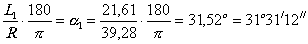 При минимальных углах поворота и соответствующих им значениях радиусов и длин переходных кривых (см. табл. 15) закругления будут иметь вид биклтоид, т.е. непосредственно сопряженных переходных кривых, без круговой вставки между ними. При угле поворота трассы α > αmin и соответствующих значениях радиуса и длины переходной кривой, приведенных в табл. 15, длину круговой кривой Lкр (м) определяют по формуле