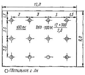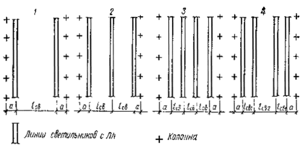 светового потока источника света; L - яркость, кд/м2; Lн - нормируемое значение яркости, кд/м2; l - расстояние, м; lсв - расстояние между светильниками, м; lx -