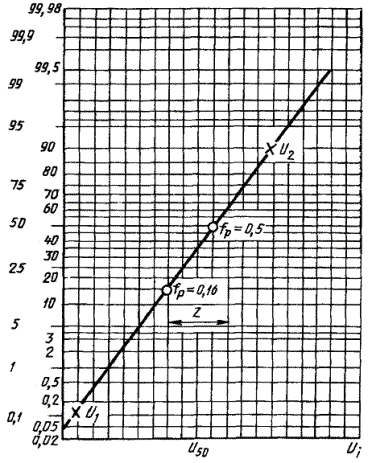 процентах наносят на вероятностную сетку по оси абсцисс в функции от Ui (рисунок А.1), где Ni - число разрядов при напряжении, равном или меньшем Ui a N - общее число приложений