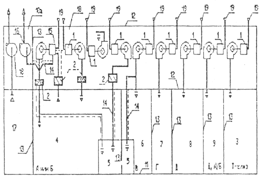 Рис. 1. Схема размещения оборудования приточных систем без рециркуляции воздуха в помещении для вентиляционного оборудования в производственном здании: 1 - оборудование приточных систем; 2 - обратный взрывоопасный клапан; 3 - тамбур-шлюз; 4 - помещение категории А или Б; 5 - комната администрации, отдыха и обогрева работающих, размещенная на площади помещения 4 или 6; 6 - помещение категории В; 7 - помещение категории Г; 8 - помещение категории Д; 9 - административно-бытовое помещение; 10 и 10а - помещение для вентиляционного оборудования; 11 - пол; 12 - покрытие или перекрытие; 13 - перегородка; 14 - транзитный воздуховод с нормируемым пределом огнестойкости; 15 - приточная часть воздуховоздушной теплоизолирующей установки; 16 - вытяжная часть воздуховоздушной теплоизолирующей установки отсасывающей воздух из помещения 4, размещаемая в помещении 10а; 17 - помещения, которые допускается обслуживать вытяжными установками 18 и другими вытяжными установками согласно рис. 5; 19 - общее приемное устройство для наружного воздуха для всех приточных установок, по п. 1.41 СНиП.