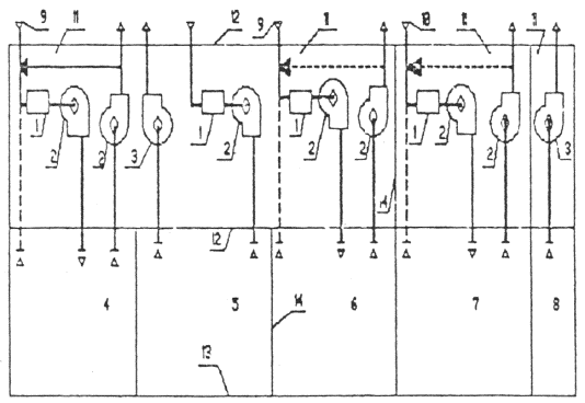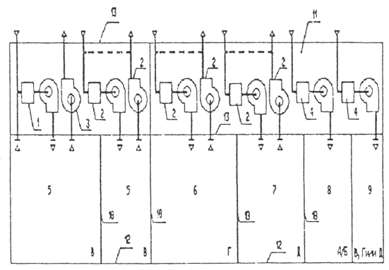 Рис. 2. Схема размещения оборудования приточных систем с рециркуляцией воздуха к п. 4.92 СНиП. 1 - оборудование приточно-вытяжной одновентиляторной системы; 2 - оборудование приточно-вытяжной двухвентиляторной системы; 3 - оборудование общеобменной вытяжной системы или системы местных отсосов; 4 - оборудование приточной прямоточной системы; 5 - помещение категории В; 6 - помещение категории Г; 7 - помещение категории Д; 8 - административное или бытовое помещение; 9 - помещение категории В, Г или Д; 10 - перегородка; 11 - помещение для вентиляционного оборудования; 12 - пол; 13 покрытие или перекрытие здания.