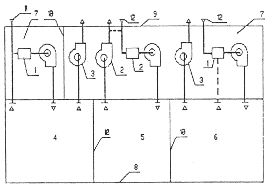 Рис. 3. Схема размещения оборудования в предназначенном для него помещении, в жилом здании, в соответствии с п.п. 4.93 и 4.94 СНиП 1 - оборудование приточно-рециркуляционной одновентиляторной системы; 2 - оборудование приточно-рециркуляционной двухвентиляторной системы с общеобменной вытяжной вентиляцией или с системой местных отсосов невзрывоопасных смесей; 3 - оборудование вытяжной системы; 4 - жилое помещение; 5 - производственное помещение для бытового обслуживания населения; 6 - помещение ресторана, магазина, сберегательной кассы и подобное; 7 - помещение для вентиляционного оборудования; 8 - пол помещения; 9 - перекрытие; 10 - перегородка; 11 - приемное устройство для наружного воздуха систем обслуживающих помещение 4; 12 - приемное устройство для наружного воздуха систем обслуживающих помещения 5 и 6 (п. 4.41 СНиП).