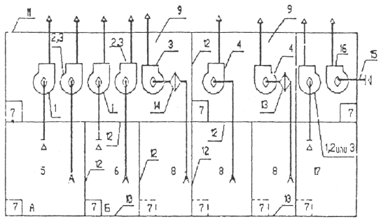 Рис. 5. Схема размещения оборудования систем вытяжной общеобменной вентиляции для помещений категорий А или Б и систем местных отсосов взрывоопасных смесей: 1 - оборудование вытяжной системы общеобменной вентиляции; 2 - оборудование системместных отсосов невзрывоопасных смесей; 3 - то же, взрывоопасных смесей, не образующих отложений в воздуховодах или в вентиляционном оборудовании; 4 - то же, образующих отложения в воздуховодах или в вентиляционном оборудовании; 5 - помещение категории А; 6 - помещение категории Б; 7 - тамбур-шлюз; 8 - помещения любой категории В, Г или Д, в которых имеются местные отсосы взрывоопасных или горючих веществ; 9 - помещение для вентиляционного оборудования; 10 - пол; 11 - покрытие; 12 - перегородка; 13 - сухой пылеуловитель или фильтр; 14 - мокрый пылеуловитель; 15 - от воздуховоздушного теплоутилизатора; 16 - вытяжная часть воздуховоздушной теплоиспользующей установки, отсасывающей воздух из помещения категории А или Б (см. рис. 1); 17 - помещение категории А или Б. Примечание. Тамбур-шлюзы устраиваются у помещений категорий А и Б, согласно п. 2.11 СНиП 2.09.02-85. Тамбур-шлюзы у помещений с выделением вредных газов или паров 1-го или 2-го классов опасности, которые упоминаются в п. 4.6 СНиП 2.04.05-91, устраиваются по технологической части проекта.