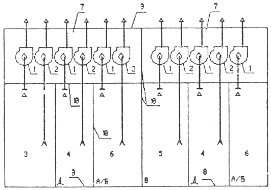 Рис. 6. Схема размещения оборудования систем вытяжной вентиляции помещений вентиляционного оборудования для помещений категорий В, Г и Д и административно-бытовых помещений: 1 - оборудование вытяжной системы общеобменной вентиляции; 2 - оборудование систем местных отсосов невзрывоопасных смесей; 3 - помещение категории Г; 4 - помещение категории Д; 5 - помещение категории В; 6 - административно-бытовое помещение; 7 - помещение для вентиляционного оборудования; 8 - пол; 9 - покрытие; 10 - перегородка. |
