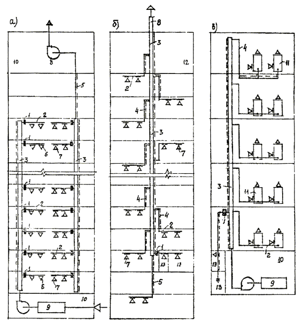 вертикальными коллекторами. Защита от проникания дыма при пожаре из помещений одного этажа в помещения других этажей предусмотрена: а) - огнезащитными клапанами на поэтажных сборных воздуховодах; б, в) - воздушными затворами на поэтажных сборных воздуховодах. 1 - огнезадерживающий клапан по п. 4.123; 2 - поэтажный сборный воздуховод; 3 - вертикальный коллектор с пределом огнестойкости по п. 4.118; 4 - воздушный затвор; 5 - транзитный воздуховод с пределом огнестойкости по п. 4.118; 6 - воздухораспределитель; 7 - вытяжное устройство; 8 - вытяжное вентоборудование; 9 - приточное вентоборудование; 10 - помещение для вентиляционного оборудования; 11 - эжекционный доводчик; 12 - технический этаж, чердак; 13 - группа «присоединяемых» помещений общей площадью более 200 км. м. другого назначения.
