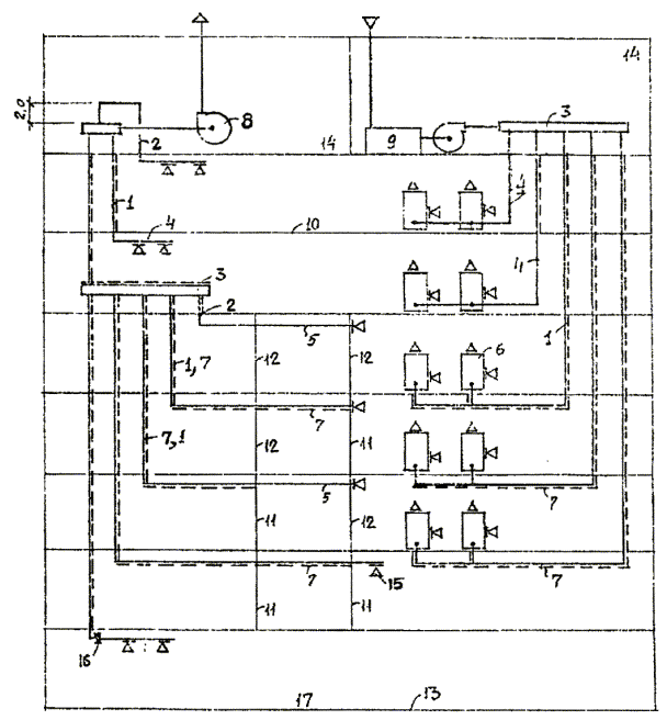 горизонтальными коллекторами. Защита от проникания дыма при пожаре из помещений одного этажа в помещения других этажей предусмотрена воздушными затворами 1 - воздушный затвор; 2 - воздушный затвор при присоединении сборного воздуховода первого этажа – вертикальная длина его до присоединения к коллектору должна быть не менее 2 м; 3 - горизонтальный коллектор; 4 - воздуховод в пределах обслуживаемого помещения; 5 - воздуховод вне пределов обслуживаемого помещения; 6 - эжекционный доводчик; 7 - транзитный воздуховод по п. 4.118; 8 - вытяжное вентоборудование; 9 - приточное вентоборудование; 10 - междуэтажное перекрытие; 11 - противопожарная стена или перегородка с нормируемым пределом огнестойкости по п. 3.1 СНиП 2.01.02-85*; 12 - стена или перегородка с ненормируемым пределом огнестойкости; 13 - пол; 14 - помещение для вентиляционного оборудования; 15 - воздухоприемное оборудование; 16 - огнезадерживающий клапан по п. 4.123; 17 - группа «присоединяемых» помещений общей площадью более 200 кв. м. другого назначения.