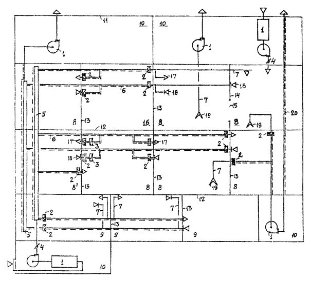 категории А, Б или В. Защита от проникания дыма при пожаре из помещений одного этажа в помещения других этажей предусмотрена огнезадерживающими клапанами. 1 - вентиляционное оборудование по пп. 4.74 и 4.75; 2 - огнезадерживающий клапан по п. 4.123; 3 - обратный клапан по п.4.110; 4 - обратный клапан в исполнении по п. 4.74; 5 - коллектор или сборный транзитный воздуховод по п. 4.119; 6 - транзитный воздуховод по п. 4.119; 7 - воздуховод в обслуживаемом им помещении по пп. 4.113 - 4.116; 8 - помещение категории А, Б или В; 8’ - помещение категории А, Б или В с воздухообменом, определенном из условия ассимиляции вредных веществ 1 и 2 класса опасности по п. 4.110; 9 - помещение категории Г или Д, общественное или административно-бытовое по п. 4.26 б, в; 10 - помещение для вентиляционного оборудования по пп. 4.98 - 4.108; 11 - покрытие здания; 12 - междуэтажное перекрытие; 13 - противопожарная переграда с нормируемым пределом огнестойкости по п. 3.1 СНиП 2.01.02-85*; 14 - стена или перегородка с ненормируемым пределом огнестойкости или имеющая проем в другое помещение площадью 1 м2 и более; 15 - проем в стене или перегородки; 16 - коридор, холл или технический этаж; 17 - воздухораспределитель по пп. 4.78 - 4.80; 18 - вытяжное устройство; 19 - местный отсос; 20 - сварной воздуховод без разъемных соединений класса П по п. 4.129 СНиП.