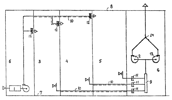 изолированных производственных помещений категорий А, Б или В по п. 4.25 в. 1 - оборудование приточной системы; 2 - оборудование вытяжной системы общеобменной вентиляции; 3,4,5 - помещения или склады категории А, Б и В в любом сочетании с выходами только наружу; 6 - помещение для вентиляционного оборудования; 7 - пол; 8 - покрытие; 9 - коллектор; 10 - транзитный воздуховод с пределом огнестойкости по п. 4.118; 11 - обратный клапан в исполнении по п.4.74; 12 - огнезадерживающий клапан; 13 - резервный вентилятор; 14 - клапан. Примечание. Воздуховоды приточной вентиляции могут быть осуществлены по схеме, принятой для вытяжной системы, и, наоборот, воздуховоды вытяжной системы могут быть осуществлены по схеме приточный вентиляции.