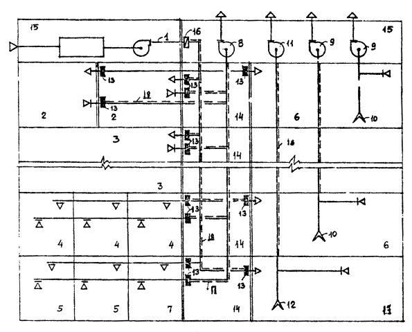 лабораторных помещений. 1 - воздуховоды приточной системы для групп помещений (расположены не более, чем на 11 этажах) категорий В, Г или Д и административно-бытовых помещений с присоединением не более двух на разных этажах кладовых категории А; 2 - помещения категории В, разделенные противопожарными преградами; 3 - технический этаж; 4 - помещения категории В, не разделенные противопожарными преградами; 5 - помещения категории Г или Д, не разделенные противопожарными преградами; 6 - кладовая категории А для хранения оперативного запаса исследуемых веществ; 7 - административно-бытовые помещения; 8 - оборудование и воздуховоды общеобменной системы для помещений 2, 3, 4, 5 и 7, проектируемой в соответствии с п. 4.26 б, при условии, что общая площадь присоединяемых помещений к системе не превышает 200 м2 (ветвь П); 9 - общая вытяжная установка и воздуховоды для общеобменной вентиляции помещения 6 и местного отсоса 10; 11 - вытяжная установка и воздуховоды для общеобменной вентиляции помещения и местного отсоса 12 от оборудования, не образующего взрыво-пожарной смеси; 13 - огнезадерживающий клапан, устанавливаемый по п. 4.123; 14 - коридор; 15 - помещение для вентиляционного оборудования; 16 - обратный клапан по п. 4.91 в исполнении по п. 4.74; 17 - помещение категории В; 18 - воздуховоды с нормируемым пределом огнестойкости по п. 4.118. Примечание. Огнезадерживающий клапан 13, на воздуховодах помещения 6 - во взрывозащитном исполнении по п. 4.74. |