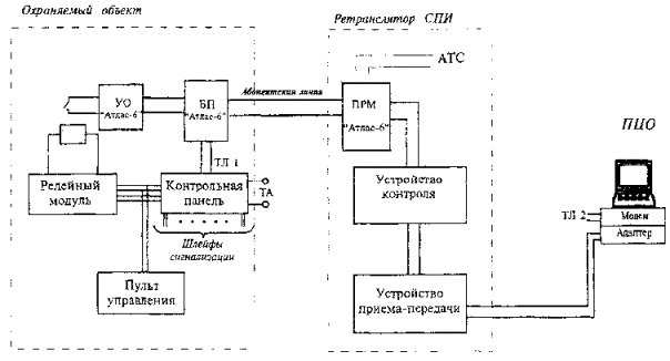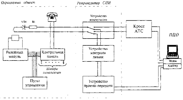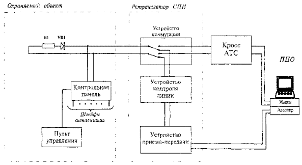 не получает информации о неисправности телефонной линии связи или ООУ. При втором способе сообщения с ООУ на ПЦО передаются посредством специально созданного постоянно действующего канала связи по выделенной (или уплотненной) телефонной линии связи с использованием дополнительно установленного на АТС оборудования. Достоинством указанного способа является постоянный контроль телефонной линии связи от ПЦО до АТС и от АТС до охраняемого объекта. При этом ПЦО в течение небольшого (установленного) интервала времени всегда получает информацию о неисправностях линий связи, ООУ или дополнительного оборудования на АТС. Недостатком способа является невозможность организации на АТС с оптоволоконными линиями связи или цифровыми системами уплотнения постоянно действующего канала связи от АТС до ПЦО с использованием существующих технических средств охраны. Кроме того, организация постоянно действующего канала связи в любом случае требует дорогостоящей аренды каналов связи. Одним из решений,