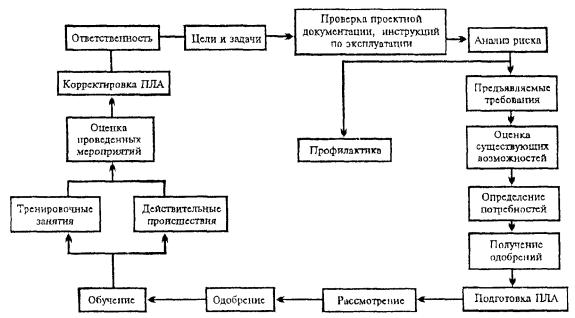 ПОРЯДОК СОСТАВЛЕНИЯ ПЛАНОВ ЛИКВИДАЦИИ АВАРИЙ НА ВЗРЫВОПОЖАРООПАСНЫХ ОБЪЕКТАХ1. План ликвидации аварий (ПЛА) должен быть составлен на каждый взрывопожароопасный объект или его взрывопожароопасный участок, цех и т.п. 2. В ПЛА должны предусматриваться: 2.1. Возможные аварии, места их возникновения и условия, опасные для жизни людей; 2.2. Мероприятия по спасению людей, застигнутых аварией; 2.3. Мероприятия по ликвидации аварий в начальной стадии их возникновения, а также первоочередные действия производственного персонала при возникновении аварий; 2.4. Места нахождения средств для спасения людей и ликвидации аварий; 2.5. Порядок взаимодействия с газоспасательными, пожарными и противофонтанными отрядами. 3. ПЛА разрабатываются комиссией, состоящей из специалистов, назначенных приказом по предприятию. ПЛА пересматриваются ежегодно. При изменении технологии, условий работы, правил безопасности в ПЛА должны быть в трехдневный срок внесены соответствующие изменения и дополнения. 4. ПЛА в количестве пяти экземпляров утверждается техническим руководителем предприятия при наличии актов проверки: состояния систем контроля технологического процесса; состояния вентиляционных устройств; наличия и исправности средств для спасения людей, противопожарного оборудования и технических средств для ликвидации аварий в их начальной стадии; исправности аварийной сигнализации, связи, аварийного освещения. 5. ПЛА должен содержать: 5.1. Оперативную часть, в которой должны быть предусмотрены вес виды возможных аварий на данном объекте, определены мероприятия по спасению людей и ликвидации аварии, а также лица, ответственные за выполнение мероприятий, и исполнители, места нахождения средств для спасения людей и ликвидации аварий, действия газоспасателей, пожарных и других подразделений; 5.2. Распределение обязанностей между отдельными лицами, участвующими в ликвидации аварии; 5.3. Список должностных лиц и учреждений, которые должны быть немедленно извещены об аварии; 5.4. Схемы расположения основных коммуникаций (технологическая схема) в соответствии с требованиями п. 3.13.1.6 настоящих Правил; 5.5. Списки инструментов, средств индивидуальной защиты, материалов, находящихся в аварийных шкафах (помещениях) с указанием их количества и основной характеристики. 6. В оперативной части ПЛА должны быть предусмотрены: 6.1. Способы оповещения об аварии (сирена, световая сигнализация, громкоговорящая связь, телефон и др.), пути выхода людей из опасных мест и участков в зависимости от характера аварии; 6.2. Действия лиц технического персонала, ответственных за эвакуацию людей и проведение предусмотренных мероприятий; 6.3. Режим работы вентиляции при возникновении аварии, в том числе включение аварийной вентиляции (при наличии); 6.4. Необходимость и последовательность выключения электроэнергии, остановки оборудования, аппаратов, перекрытия источников поступления вредных и опасных веществ; 6.5. Выставление на путях подхода (подъезда) к опасным местам постов для контроля за пропуском в загазованную и опасную зоны; 6.6. Способы ликвидации аварий в начальной стадии. Первоочередные действия технического персонала по ликвидации аварий (пожара), предупреждению увеличения их размеров и осложнений. Осуществление мероприятий по предупреждению тяжелых последствий аварий. Порядо