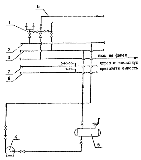 без компрессорной установки 1 - наливной стояк, 2 - коллектор налива, 3 - газоуравнительная линия (трубопровод паровой фазы), 4 - насос, 5 - емкость для сжиженных углеводородных газов, 6 - трубопровод сброса на свечу, 7 - трубопровод азота, 8 - трубопровод водяного пара Приложение 7