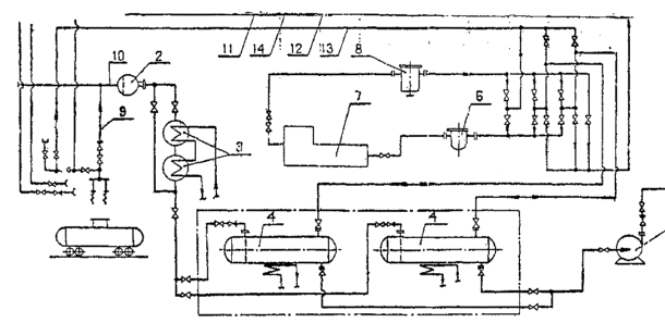 компрессорной установкой 1 - цистерна, 2 - фильтр, 3 - подогреватель, 4 - горизонтальная емкость для сжиженного углеводородного газа, 5 - насос, 6 - сепаратор, 7 - компрессор, 8 - маслоотделитель, 9 - сливной стояк, 10 - сливной коллектор жидкого продукта, 11 - трубопровод азота, 12 - трубопровод сброса на факел через дренажную емкость, 13 - трубопровод паров сжиженного углеводородного газа, 14 - трубопровод водяного пара Приложение 9