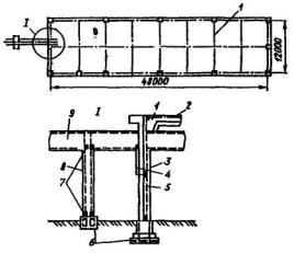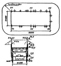 Рис. 4. Молниезащита здания I категории отдельно стоящим тросовым молниеотводом (& = 300 Ом×м, S0£4 м, Sз£6 м, Sв1³3,5 м): 1 - трос; 2 - граница зоны защиты; 3 - ввод подземного трубопровода; 4 - граница распространения взрывоопасной концентрации; 5 - соединения арматуры, выполняемые сваркой; 6 - железобетонный фундамент; 7 - закладные элементы для присоединения оборудования; 8 - заземляющий проводник из стали 4×40 мм; 9 - заземлители - железобетонные подножники; 10 - граница зоны защиты на отметке 10,8 м