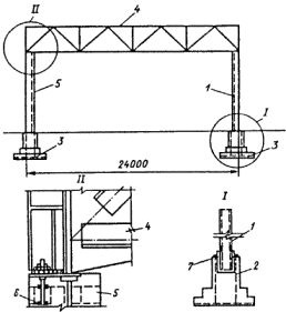 Рис. 6. Молниезащита здания II категории с металлическими фермами (в качестве токоотводов и заземлителей использована арматура железобетонных колонн и фундаментов): 1 - арматура колонны; 2 - арматура фундамента; 3 - заземлитель; 4 - стальная ферма; 5 - железобетонная колонна; 6 - анкерные болты, привариваемые к арматуре; 7 - закладная деталь