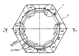 Рис. 9. Молниезащита металлического резервуара вместимостью 20 тыс. м3 со сферической крышей и понтоном: 1 - клапан аварийного выброса газов; 2, 3 ‑ то же, что на рис. 8; 4 ‑ понтон; 5 - зона защиты на высоте hх = 23 м; 6 ‑ гибкий кабель