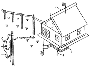 Рис. 10. Молниезащита сельского дома тросовым молниеотводом, установленным на крыше: 1 - тросовый молниеприемник; 2 - ввод воздушной линии электропередачи (ВЛ) и заземление крюков ВЛ на стене; 3 - токоотвод; 4 – заземлитель Требования
