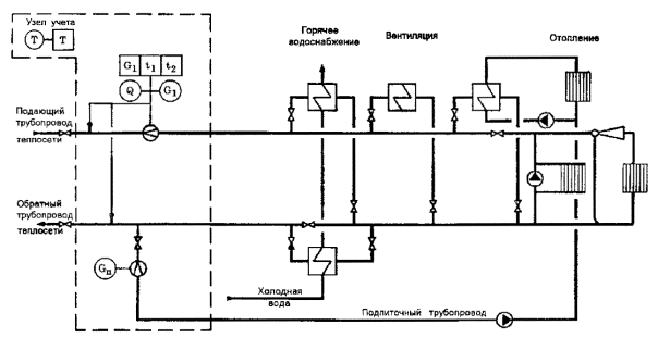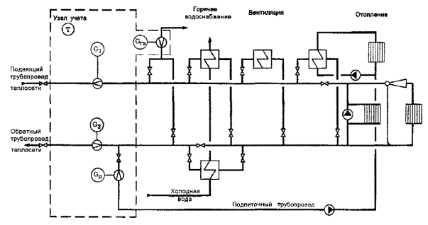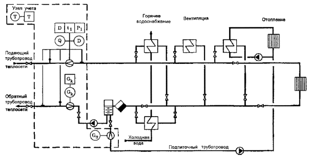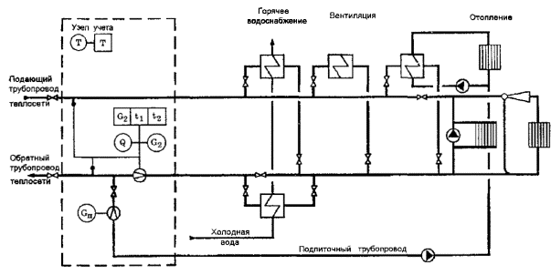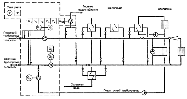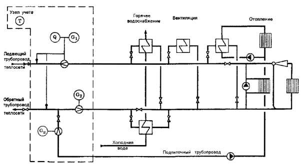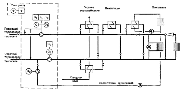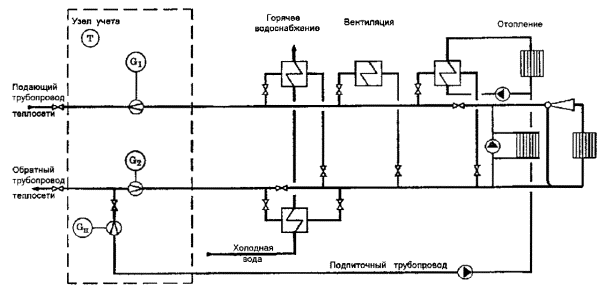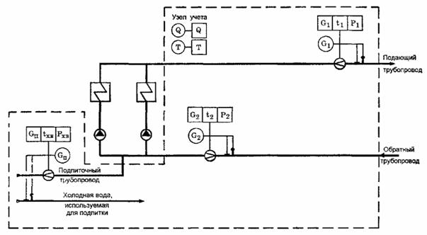 где k - количество узлов учета на паропроводах; т - количество узлов учета на конденсатопроводах; Di - масса пара, отпущенного источником теплоты по каждому паропроводу; Gкj - масса конденсата, полученного источником по каждому конденсатопроводу; hi - энтальпия пара в соответствующем паропроводе; hкj - энтальпия конденсата в соответствующем конденсатопроводе; hхв - энтальпия холодной воды, используемой для подпитки. Средние значения энтальпии за соответствующий интервал времени определяются на основании измерений среднечасовых температур и давлений. 3. УЧЕТ ТЕПЛОВОЙ ЭНЕРГИИ И ТЕПЛОНОСИТЕЛЯ У ПОТРЕБИТЕЛЯ В ВОДЯНЫХ СИСТЕМАХ ТЕПЛОПОТРЕБЛЕНИЯ3.1. Организация учета тепловой энергии и теплоносителя, полученных водяными системами теплопотреблениявремя работы приборов узла учета; полученная тепловая энергия; масса (объем) теплоносителя, полученного по подающему трубопроводу и возвращенного по обратному трубопроводу; масса (объем) теплоносителя, полученного по подающему трубопроводу и возвращенного по обратному трубопроводу за каждый час; среднечасовая и среднесуточная температура теплоносителя в подающем и обратном трубопроводах узла учета. В системах теплопотребления, подключенных по независимой схеме, дополнительно должна определяться масса (объем) теплоносителя, расходуемого на подпитку. В открытых системах теплопотребления дополнительно должны определяться: масса (объем) теплоносителя, израсходованного на водоразбор в системах горячего водоснабжения; среднечасовое давление теплоносителя в подающем и обратном трубопроводах узла учета. Среднечасовые и среднесуточные значения параметров теплоносителя определяются на основании показаний приборов, регистрирующих параметры теплоносителя. Принципиальная схема размещения точек измерения массы (объема) теплоносителя, его температуры и давления, состав измеряемых и регистрируемых параметров теплоносителя в открытых системах теплопотребления приведены на рис. 3, в закрытых системах теплопотребления - на рис. 4.
