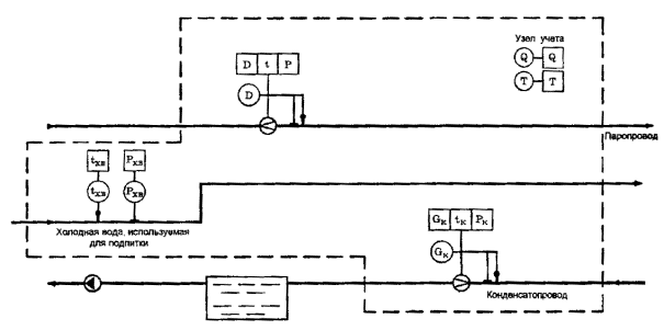 где а - количество узлов учета на подающих трубопроводах; b - количество узлов учета на обратных трубопроводах; m - количество узлов учета на подпиточных трубопроводах; G1i - масса теплоносителя, отпущенного источником теплоты по каждому подающему трубопроводу; G2j - масса теплоносителя, возвращенного источнику теплоты по каждому обратному трубопроводу; Gпk - масса теплоносителя, израсходованного на подпитку каждой системы теплоснабжения потребителей тепловой энергии; h1i - энтальпия сетевой воды в соответствующем подающем трубопроводе; h2i - энтальпия сетевой воды в соответствующем обратном трубопроводе; hxвk - энтальпия холодной воды, используемой для подпитки соответствующей системы теплоснабжения потребителей тепловой энергии. Средние значения энтальпий за соответствующий интервал времени определяются на основании измерений среднечасовых температур и давлений. 2.3. Организация учета тепловой энергии и теплоносителя, отпущенных в паровые системы теплоснабжения2.3.1. Узлы учета тепловой энергии пара на источнике теплоты (ТЭЦ, РТС, котельной и т.п.) оборудуются на каждом из его выводов. Узлы учета тепловой энергии оборудуются у границы раздела балансовой принадлежности трубопроводов в местах, максимально приближенных к головным задвижкам источника. Не допускается организация отборов теплоносителя на собственные нужды источника после узла учета тепловой энергии, отпускаемой в системы теплоснабжения потребителей. 2.3.2. На каждом узле учета тепловой энергии источника теплоты с помощью приборов должны определяться: время работы приборов узла учета; отпущенная тепловая энергия; масса (объем) отпущенного пара и возвращенного источнику теплоты конденсата; тепловая энергия, отпущенная за каждый час; масса (объем) отпущенного пара и возвращенного источнику теплоты конденсата за каждый час; среднечасовые значения температуры пара, конденсата и холодной воды, используемой для подпитки; Среднечасовые значения давления пара, конденсата и холодной воды, используемой для подпитки. Среднечасовые значения параметров теплоносителя, а также их средние величины за какой-либо другой промежуток времени определяются на основании показаний приборов, регистрирующих параметры теплоносителя. Принципиальная схема размещения точек измерения массы (объема) теплоносителя, состав измеряемых и регистрируемых параметров приведены на рис. 2.