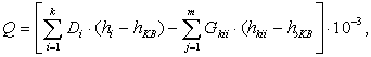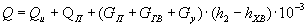 где Qи - тепловая энергия, израсходованная потребителем, по показаниям теплосчетчика; Qп - тепловые потери на участке от границы балансовой принадлежности системы теплоснабжения потребителя до его узла учета. Эта величина указывается в Договоре и учитывается, если узел учета оборудован не на границе балансовой принадлежности; Gп - масса сетевой воды, израсходованной потребителем на подпитку систем отопления, определенная по показаниям водосчетчика (учитывается для систем, подключенных к тепловым сетям по независимой схеме); Gгв - масса сетевой воды, израсходованной потребителем на водоразбор, определенная по показаниям водосчетчика (учитывается для открытых систем теплопотребления); Gу - масса утечки сетевой воды в системах теплопотребления. Ее величина определяется как разность между массой сетевой воды G1 по показанию водосчетчика, установленного на подающем трубопроводе, и суммарной массой сетевой воды (G2+Gгв) по показаниям водосчетчиков, установленных соответственно на обратном трубопроводе и трубопроводе горячего водоснабжения, Gy = [G1 - (G2 + Gгв)]. h2 - энтальпия сетевой воды на выводе обратного трубопровода источника теплоты; hхв - энтальпия холодной воды, используемой для подпитки систем теплоснабжения на источнике теплоты. Величины h2 и hхв определяются по измеренным на узле учета источника теплоты средним за рассматриваемый период значениям температур и давлений. В системах теплопотребления, где приборами учета определяется только масса (объем) теплоносителя, количество израсходованной тепловой энергии Qи находится по формуле: