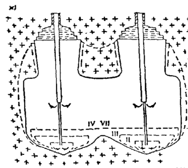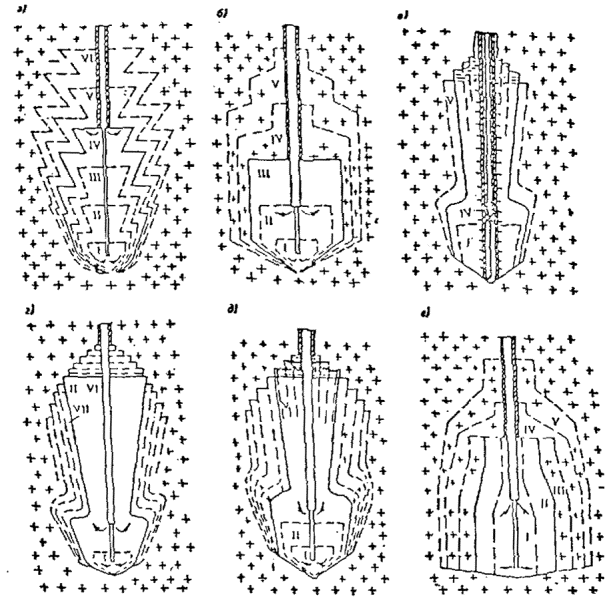 2.23 Создание выработок-емкостей бесшахтных хранилищ следует предусматривать, как правило, через одну скважину. Допускается создание выработок-емкостей через несколько скважин. 2.24 При строительстве выработок-емкостей через одну скважину следует принимать одну из следующих технологических схем растворения соли водой: снизу вверх с перемещением внешней подвесной колонны на каждом этапе (рисунок 7,а); снизу вверх без перемещения внешней подвесной колонны (рисунок 7,б); с подачей растворителя через перфорированную подвесную колонну (рисунок 7,в); сверху вниз без перемещения внешней подвесной колонны с постепенным накоплением нерастворителя в верхней части растворяемой выработки (рисунок 7,г); "комбинированная" схема, когда нижняя часть выработки создается по схеме "снизу вверх", а верхняя - по схеме "сверху вниз" (рисунок 7,д); с применением энергии "затопленных струй" с вводом растворителя в нижнюю часть выработки через насадки (рисунок 7,е). 2.25 При строительстве выработок-емкостей через одну скважину допускается создавать подземные выработки одну над другой (двухъярусного типа). Выработки сообщаются друг с другом и с поверхностью земли общей эксплуатационной скважиной. 2.26 При строительстве резервуаров через две скважины (рисунок 7,ж) следует предусматривать как независимую, так и совместную подачу растворителя. Соединение выработок следует предусматривать, как правило, сбойкой гидроврубов или с помощью специальных устройств.