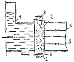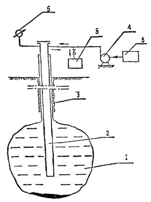 (45) где 1,1 - коэффициент запаса; DPt - величина изменения давления на устье скважины на продуктовой линии от первоначального до испытательного. Па. Испытание производится следующим образом: в выработку закачивают насыщенный рассол до достижения испытательного давления, величина которого определяется в соответствии с формулой (41); затем закачка рассола прекращается и фиксируется изменение давления на устье скважины в подвесной колонне в течение 3-х суток через каждый час. Вычисляется ежечасовой темп изменения давления на устье скважины в межтрубном пространстве обсадной и внешней подвесной колонн, равный разности показаний манометра за предыдущий и текущий час. 1 - выработка-емкость; 2 - подвесная колонна; 3 - обсадная колонна; 4 - насос; 5 - мерная емкость; 6 - манометр Рисунок