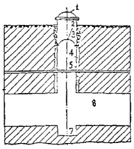 перемычки в обсадной трубе; 3 - устье ствола; 4 - продукто-непроницаемый раствор: