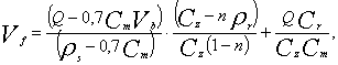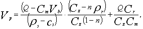 где 0,7 - коэффициент, учитывающий разность между среднесменной и средней концентрацией рассола в выработке; Cm - среднесменная концентрация выходящего рассола, т/м3; rs - плотность соли, т/м3; Vb - объем нерастворителя в выработке, м3; Cz- концентрация нерастворимых включений в осадке, т/м3; rr - плотность нерастворимых включений, т/м3; Cr - концентрация взвешенных нерастворимых включений в рассоле, т/м3; п - среднее объемное содержание нерастворимых включений в массиве каменной соли, м3/м3. Достигаемый объем выработки Vp, м3, определяется по формуле
