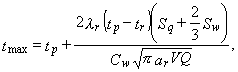 ri - плотность льда, кг/м3; rw - плотность воды, кг/м3; S - поверхность теплообмена воды с породой, м2; Vw - объем воды, сливаемой в выработки-емкости, м3; Сw - объемная теплоемкость воды, Дж/м3 · °С); t - температура воды, сливаемой в выработку-емкость,°С; tp . температура фазового перехода воды в лед, °С; lr - коэффициент теплопроводности вечномерзлых пород, Вт/м×°С; tr - естественная температура вечномерзлых пород, °С. Максимально допустимую температуру воды tmax, °C, сливаемой в выработки-емкости для намораживания ледяной облицовки, следует определять по формуле