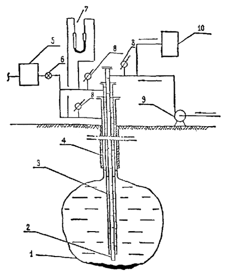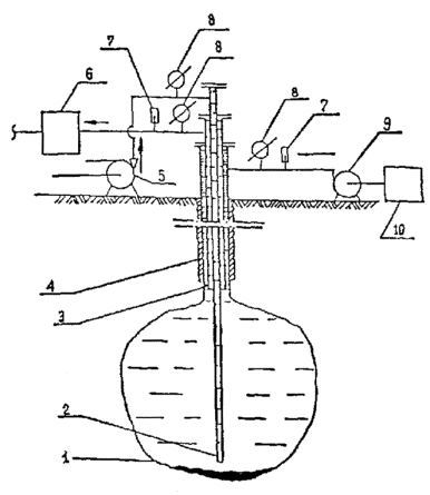 (42) где rf - средняя по скважине плотность испытательной среды, кг/м3. 4.22 Испытательное давление на устье скважины не должно превышать значения, допустимого по условиям прочности элементов устьевой обвязки и обсадных труб в соответствии с ГОСТ 632. 4.23 При испытании на герметичность обсадных колонн скважин бесшахтных резервуаров компенсационным методом допускается использовать для проведения испытания подвесные колонны, использовавшиеся в процессе создания выработки-емкости (рисунок 13). 1 - выработка-емкость; 2 - внутренняя подвесная колонна; 3 - внешняя подвесная колонна; 4 - обсадная колонна; 5 - насос для закачки рассола; 6 - мерная емкость; 7 - термометр; 8 - манометр; 9 - насос для закачки испытательной среды; 10 - мерная емкость Рисунок