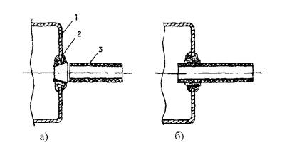 Рис. 14. Схема устройства уплотненного ввода в коробку пластмассовых труб для электропроводок с использованием втулки: а) до монтажа, б) после монтажа; 1 - корпус коробки; 2 - уплотнительная