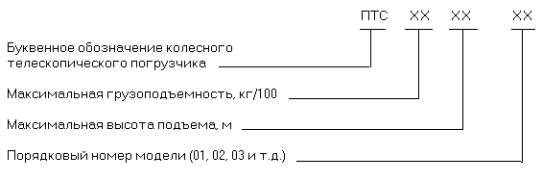 16215. 4.2 В технических условиях на погрузчики конкретных моделей должны быть установлены обязательная номенклатура показателей, приведенная ниже, и их значения: - дымность отработавших газов двигателя погрузчика в соответствии с ГОСТ 17.2.2.02 (по документации на двигатель); - выбросы вредных веществ с отработавшими газами из системы выпуска двигателя в соответствии с ГОСТ 17.2.2.05 (по документации на двигатель); - уровень звука на рабочем месте по ГОСТ 12.1.003; - параметры вибрации на рабочем месте и органах управления по ГОСТ 12.1.012. 4.3 Порядок индексации конкретных моделей погрузчика приведен на схеме: ИНДЕКСАЦИЯ КОЛЕСНЫХ ТЕЛЕСКОПИЧЕСКИХ ПОГРУЗЧИКОВ