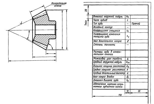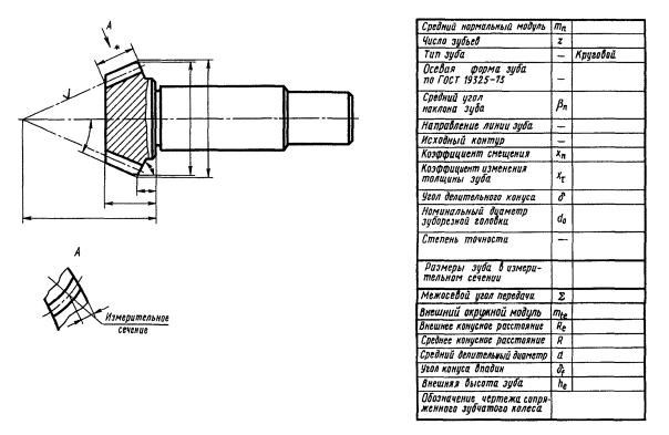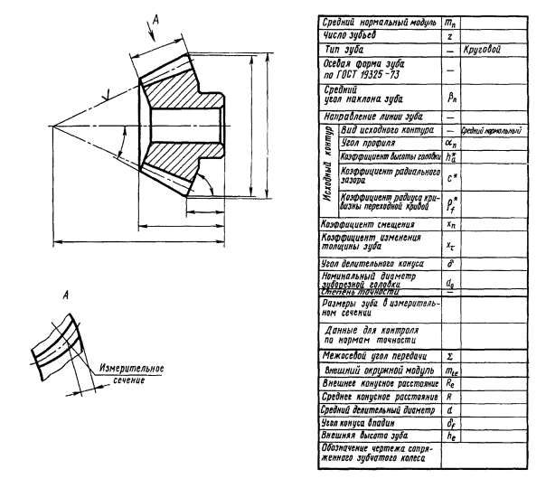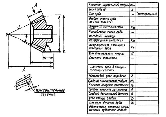 утвержденным в январе 1981 г. (ИУС 3-81). 1. Настоящий стандарт устанавливает правила выполнения чертежей конических зубчатых колес с прямолинейным профилем исходного контура в части указания параметров зубчатого венца. Стандарт полностью соответствует CT СЭВ 859-78. (Измененная редакция, Изм. № 1). 2. Чертежи конических зубчатых колес должны быть выполнены в соответствии с требованиями стандартов Единой системы конструкторской документации и настоящего стандарта. 3. На изображении конического зубчатого колеса (черт. 1 - 4) должны быть указаны а) внешний диаметр вершин зубьев до притупления кромки; б) внешний диаметр вершин зубьев после притупления кромки (при необходимости); в) расстояние от базовой плоскости до плоскости внешней окружности вершин зубьев; г) угол конуса вершин зубьев; д) угол внешнего дополнительного конуса. Допускается указывать дополнительный угол к углу внешнего дополнительного конуса; е) ширина зубчатого венца. В случае, когда передний торец зубчатого колеса выполняют плоскорезанным, размер ширины зубчатого венца должен быть указан как справочный (черт. 3); ж) базовое расстояние; з) размеры фасок или радиусы кривизны линий притупления на кромках зубьев. Допускается указывать размеры фасок или радиусы кривизны линий притупления в технических требованиях чертежа; и) положение измерительного сечения. 4. На чертеже зубчатого колеса должна быть помещена таблица параметров зубчатого венца (черт. 1). 5. Таблица параметров должна состоять из трех частей, которые должны быть отделены друг от друга сплошными основными линиями: первая часть - основные данные; вторая часть - данные для контроля; третья часть - справочные данные. 6. В первой части таблицы параметров должны быть приведены: а) модуль: - внешний окружной те - для прямозубого зубчатого колеса; - внешний нормальный тne - для зубчатого колеса с тангенциальными зубьями; - средний нормальный mn - для зубчатого колеса с круговыми зубьями; б) число зубьев z, для зубчатого сектора - число зубьев секторного зубчатого колеса (на полной окружности); в) тип зуба надписью «Прямой», «Тангенциальный» или «Круговой»; г) осевая форма зуба по ГОСТ 19325-73 - для зубчатых колес с тангенциальными и круговыми зубьями; д) угол наклона зуба: - внешний bne - для зубчатого колеса с тангенциальными зубьями; - средний bn - для зубчатого колеса с круговыми зубьями; е) направление линии зуба надписью «Правое» или «Левое»; ж) исходный контур: - стандартный - ссылкой на соответствующий стандарт; - нестандартный - указанием сечения, к которому относится исходный контур (вид исходного контура), и следующими параметрами (черт. 4): угол профиля an; коэффициент высоты головки h*a; коэффициент радиуса кривизны переходной кривой r*f; коэффициент радиального зазора с*. Если исходный контур не может быть определен перечисленными параметрами, на чертеже должно быть приведено его изображение с необходимыми размерами; з) коэффициент смещения с соответствующим знаком: внешний окружной xe - для зубчатого колеса с прямыми зубьями; внешний нормальный хne - для зубчатого колеса с тангенциальными зубьями; средний нормальный xn - для зубчатого колеса с круговыми зубьями. Допускается вместо величины xn указывать внешний окружной коэффициент смещения хte. При отсутствии смещения следует проставлять 0; и) коэффициент изменения толщины зуба хt с с