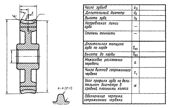 хорде высота до хорды зуба 12. В третьей части таблицы параметров зубчатого колеса должны быть приведены: а) межосевое расстояние передачи а; б) число витков сопряженного червяка z1; в) угол профиля зуба на делительном диаметре в средней плоскости колеса а; г) число зубьев сектора; д) при необходимости - прочие справочные данные, например, модуль; е) обозначение чертежа сопряженного червяка. 13. Неиспользуемые строки таблицы параметров следует исключать или прочеркивать. 14. Примеры указания параметров зубчатого венца на чертежах червяков и колес приведены на черт. 1 и 2. Пример указания параметров зубчатого венца